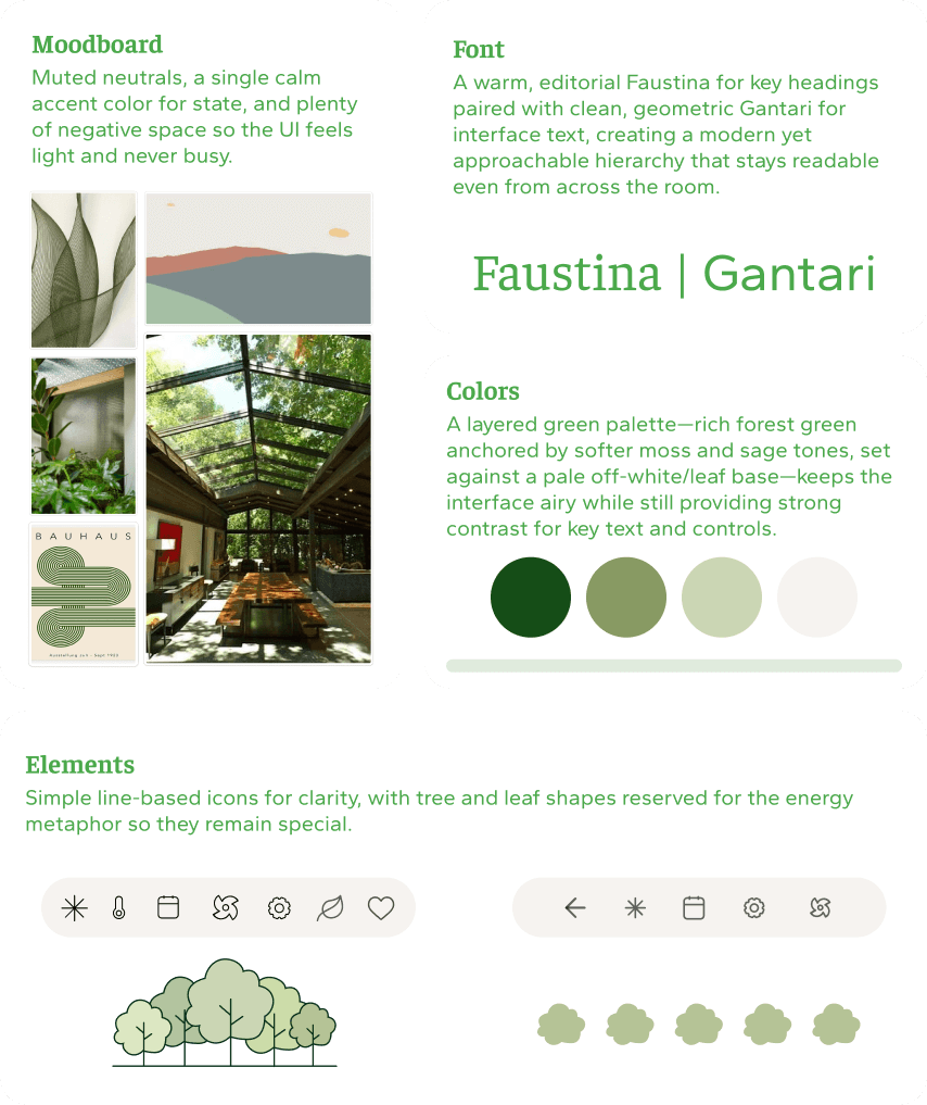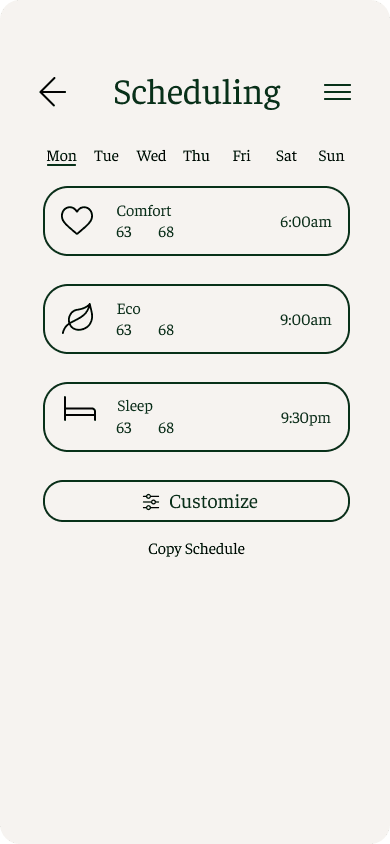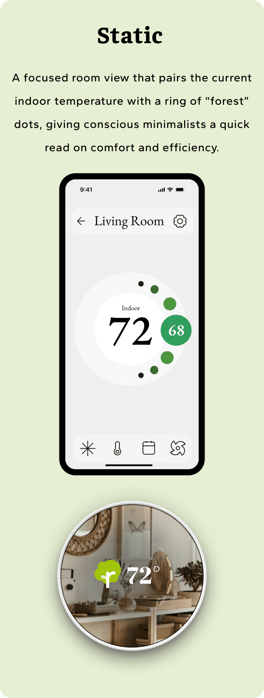 Design a unified thermostat experience that spans hardware and mobile, with three tailored directions that all share the same core flows. For Sparrow’s Nest, the goal was to help conscious minimalists see the impact of their temperature choices, build sustainable habits, and manage schedules quickly - through a minimal, distraction-free interface anchored by a simple tree-based energy metaphor.