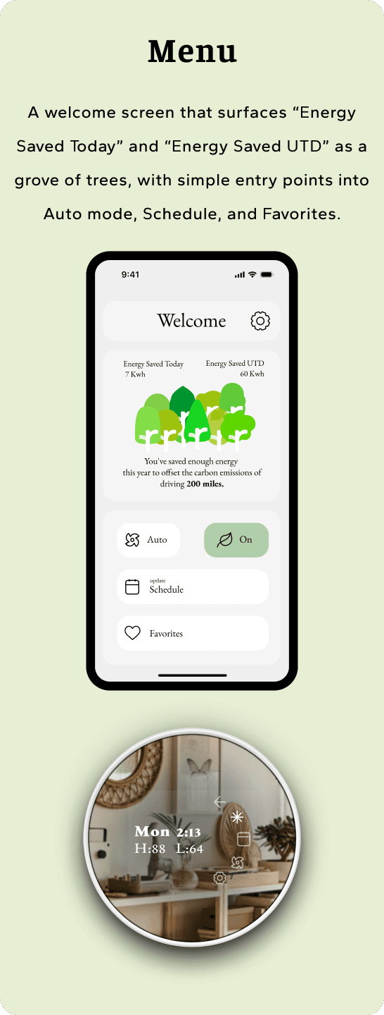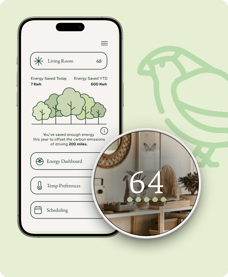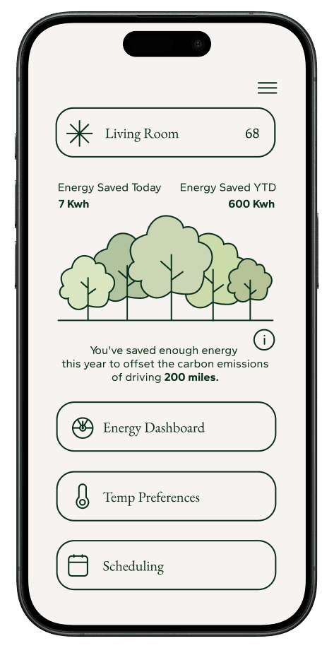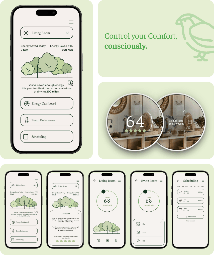 Instead of graphs and complex controls, Sparrow’s Nest uses a tree-based visual metaphor to show how everyday decisions grow (or shrink) a “forest” of energy savings over time. Both the thermostat and companion app focus on a few clear actions, gentle feedback, and a layout that feels as minimal as the people using it.