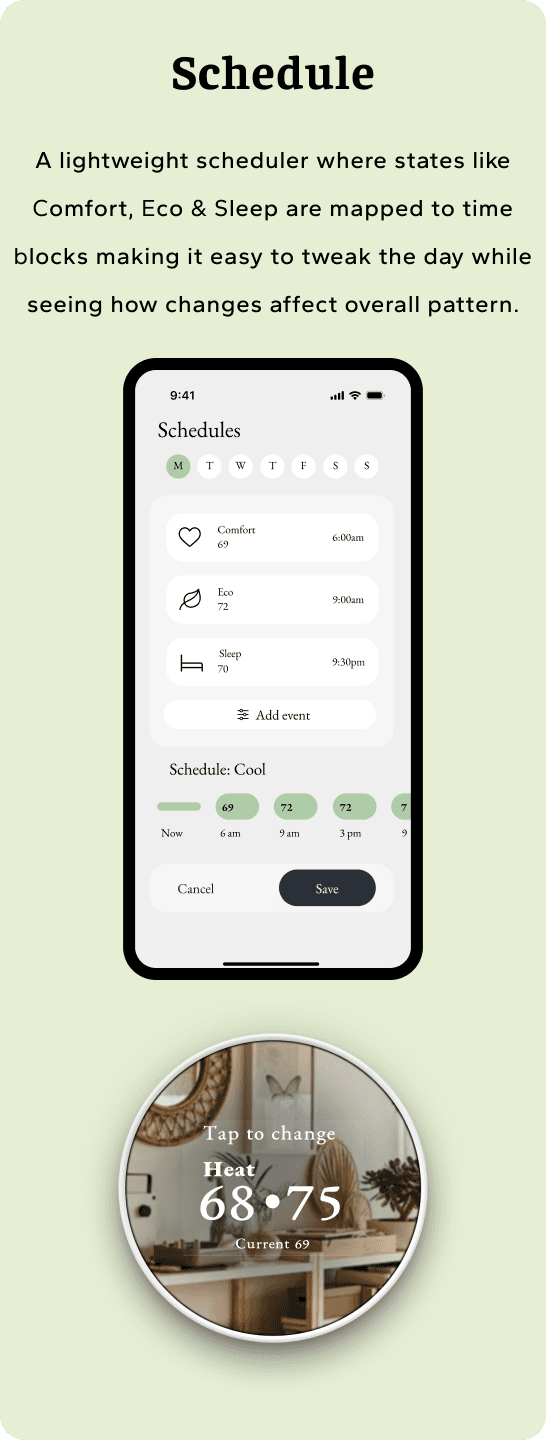 Schedule → cleaned up spacing, labels, and state pills (Comfort / Eco / Sleep) so the day’s pattern reads left-to-right like a simple timeline, making tweaks feel lighter.